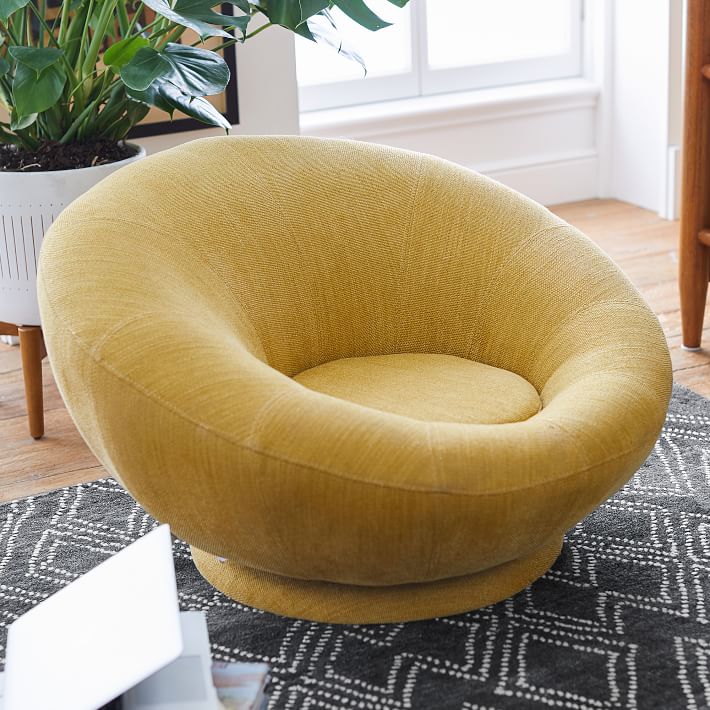 This plush swivel chair features signature chocolate upholstery with printed accent pillows and a suggested ottoman which features their Big Swirl Chocolate print. West elm x pbt Basket Slub Dark Horseradish Groovy Swivel Chair. Back to Top.